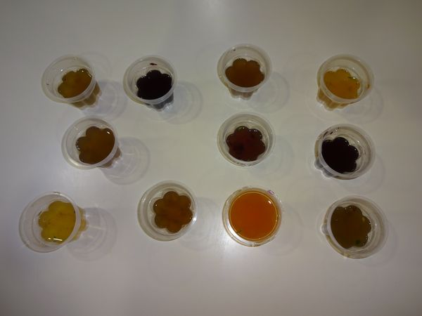 机に並べ、「オレンジジュース」「ぶどうジュース」「コーラ」「イチゴ味」等、美味しそうな色水が出来上がり笑顔が溢れていました。